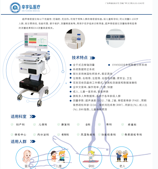作为一家专注于双能X射线骨密度仪、超声骨密度仪医疗器械领域的研发、生产与销售的科技企业,辛宇弘医疗科技当前拥有多项专利认证及资质证书,以准确技术、可靠品质,为各级医疗机构提供一站式诊断解决方案,同时为临床诊断提供准确的影像支撑与数据参考。